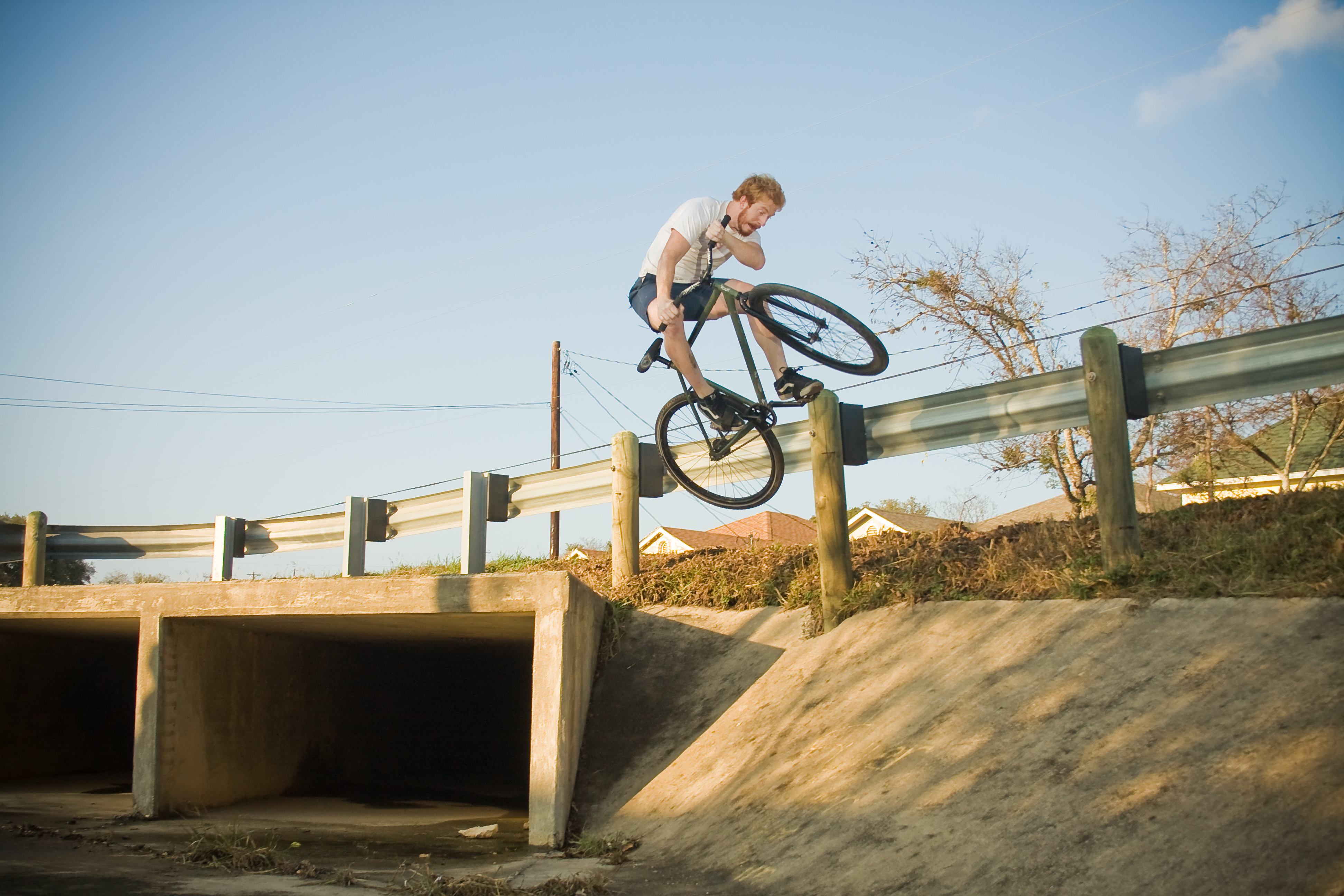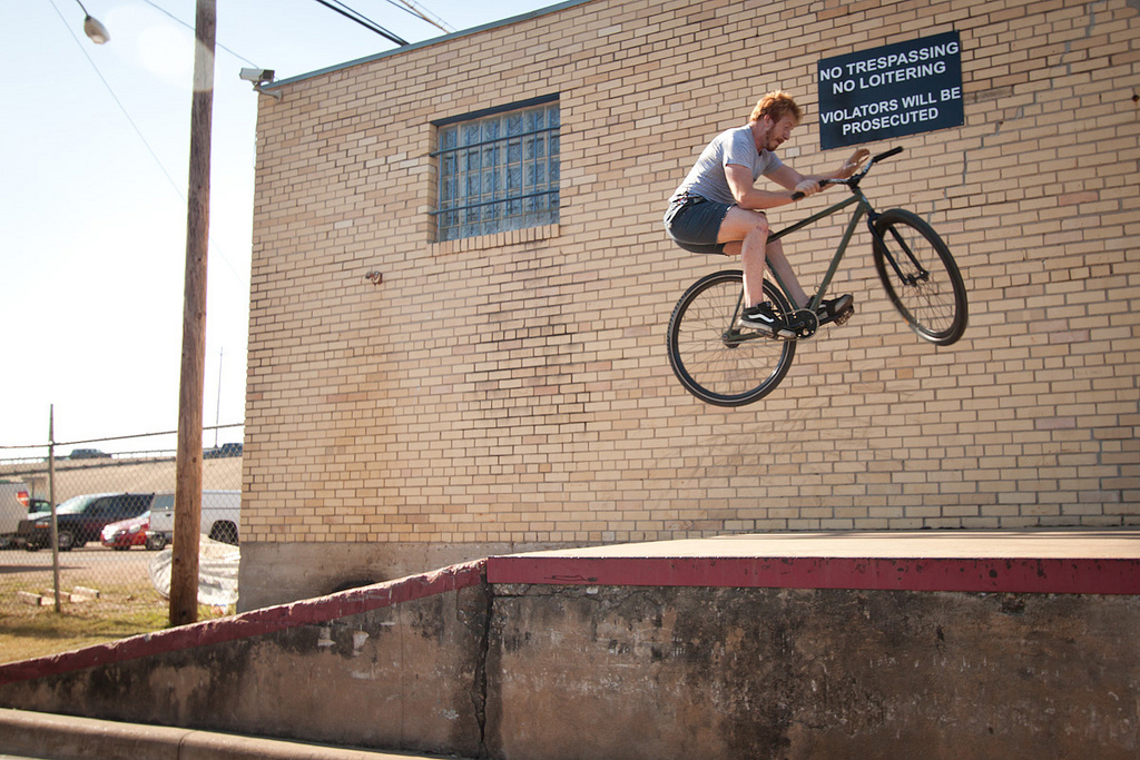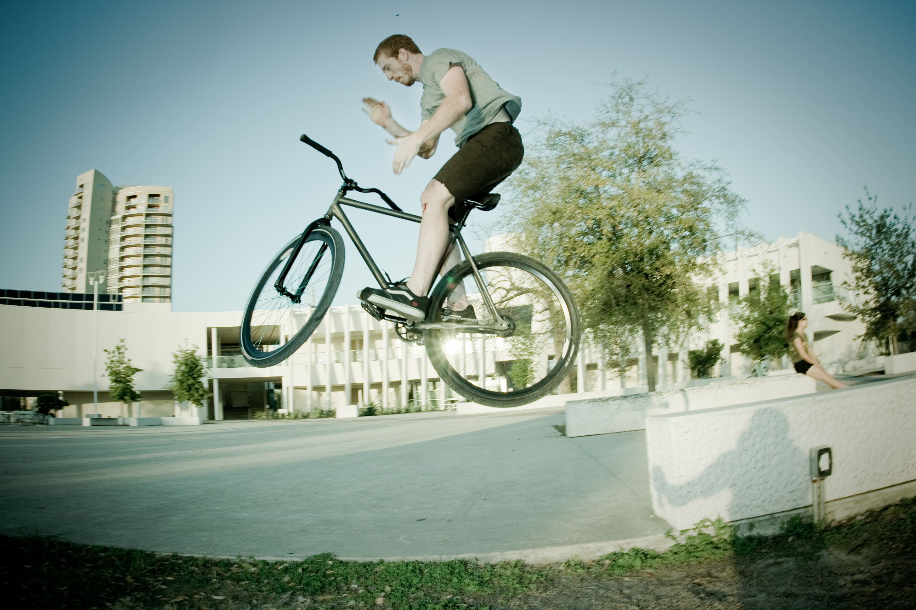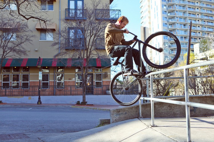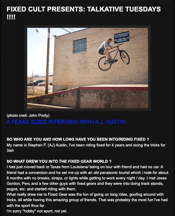 AJ Austin is a Texas native 700c FGFS rider who rose to prominence around 2009. His friendship and edits with John Watson, Eric Puckett, and Justin Taylor brought AJ to the frontlines of the early Fixed Gear trick scene and helped put the Texas scene on the map.