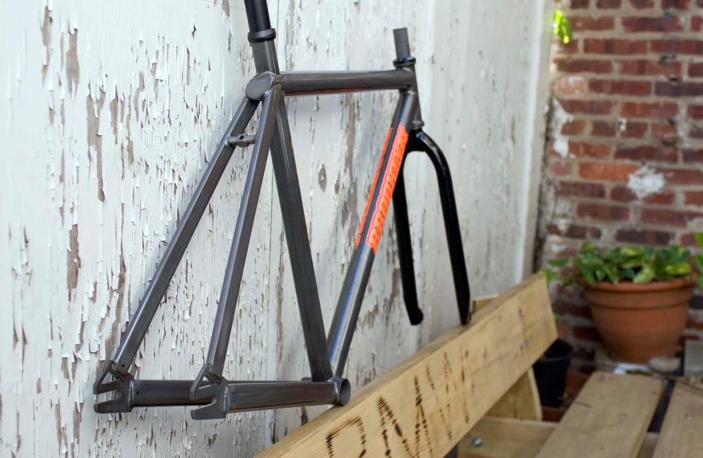 It’s been a long time coming, but our first batch of Brooklyn designed, V2. Gangsta’ framesets are now ready to go. The frameset includes a V2. Gangsta’ Track frame, one of our “Cluster-forks”, a Brooklyn branded integrated headset, a seatpost, and seatpost clamp. MSRP for all of this is $595. Stock colors are currently a “raw clearcoat” and “fire-engine red”. Custom colors are available for an additional charge. The frame and fork are both drilled to allow for the mounting of a caliper type brake. Dealer inquiries are welcome.