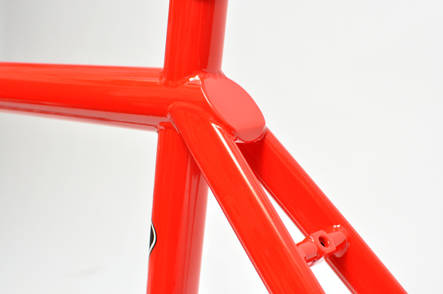 The seatstay junction of the Gangsta’ Track is probably the most recognizable feature of the frame. The pierced top tube allows for an extra large weld area for the seatstay, making for a very stiff and strong rear triangle.
