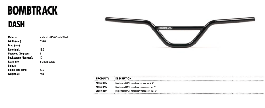 The Bombtrack dash bar features a full liquid post heat-treatment on 4130 M2 crmo with 7/8″ multiple butted tubing. With a rise of 5″, and a width of 29″, it’s probably one of the longest, and widest bar on the market.