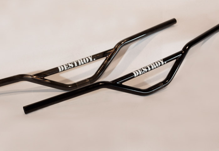 Destroy Titty Bar V2 Description: Details: Release Date: November 2012 Manufacturer: Destroy Bikes MSRP: n/a Color(s): Trans Black Raw Size(s): n/a Gallery: Specifications: SPECS: 32″ wide 5 degrees up sweep 8 degrees back sweep hand made and welded in sacremento trans black powdercoat See Also: Destroy Titty Bar Daniel Torres Destroy Bikes