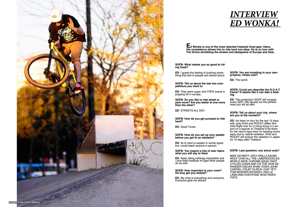 Edward Laforte, mostly known as Wonka, is a pioneer to the FGFS and Fixed Gear scene as a whole. Based in Brooklyn, New York, he came up as a bike messenger around in the mid 2000s commuting on a fixed gear bike. As he ripped through the streets of New York for years, his antics were finally documented in 2008 and the video blew up in the fixed gear community. Haters and fans flocked to the video, and a whole new era of BMX influenced riding was about to be ushered in.