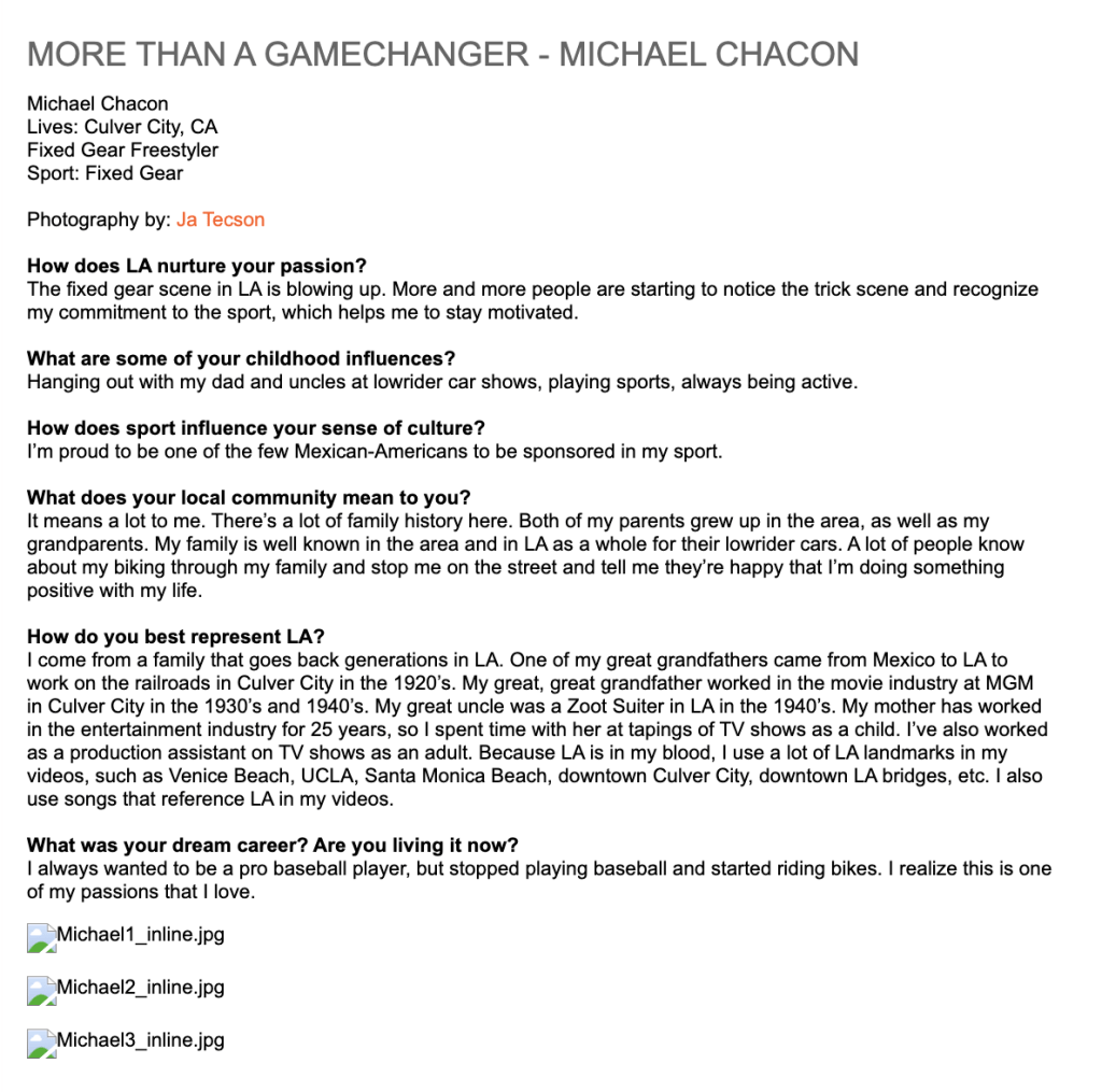 Michael Chacon is a Fixed Gear Freestyle pioneer based out of Culver City, CA. His flashy spins got him noticed in 2009, where various blogs would repost his videos on his Leader TRK. His flat ground mastery would later be recognized as his signature style, where he propelled into Fixed Gear stardom.