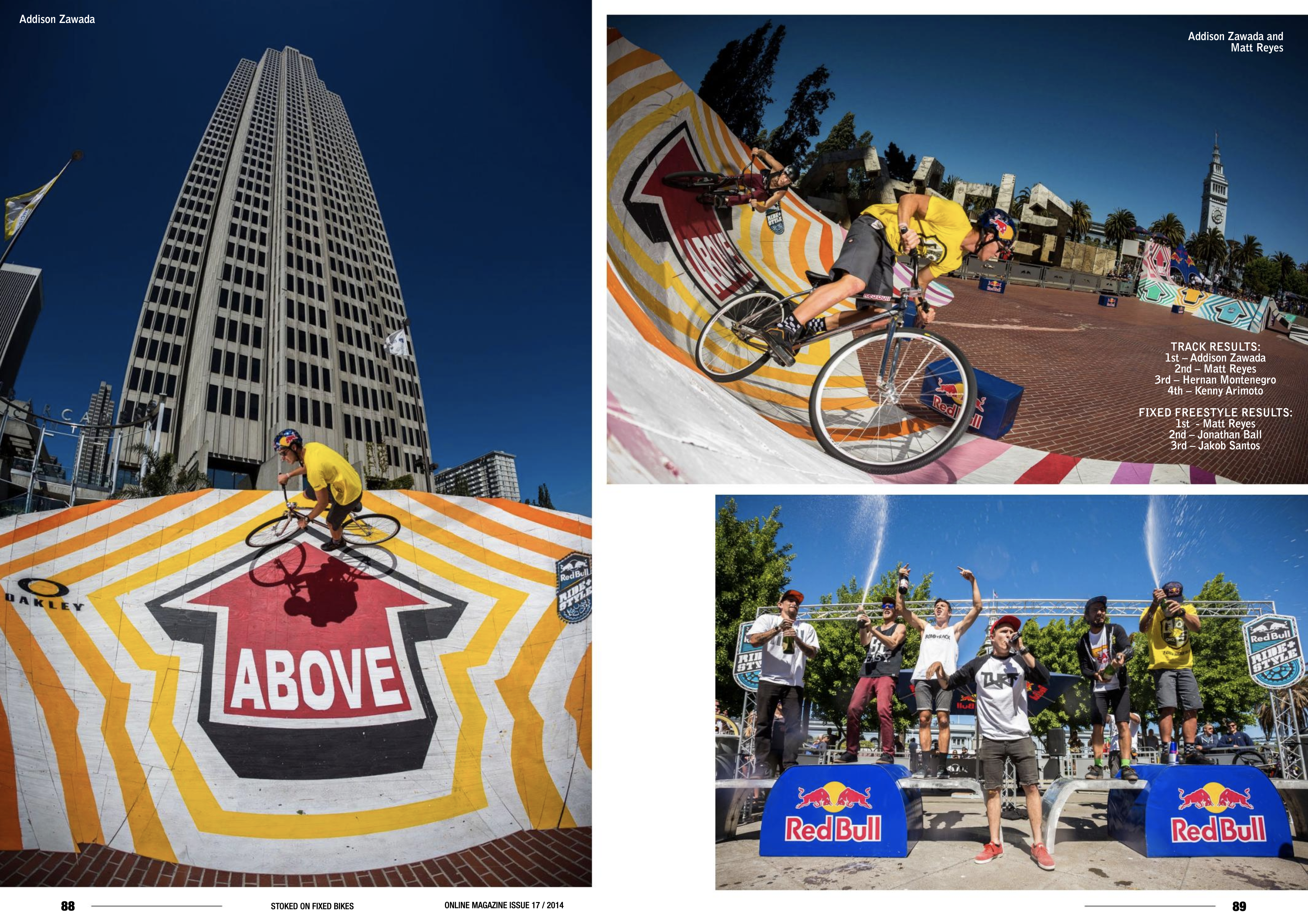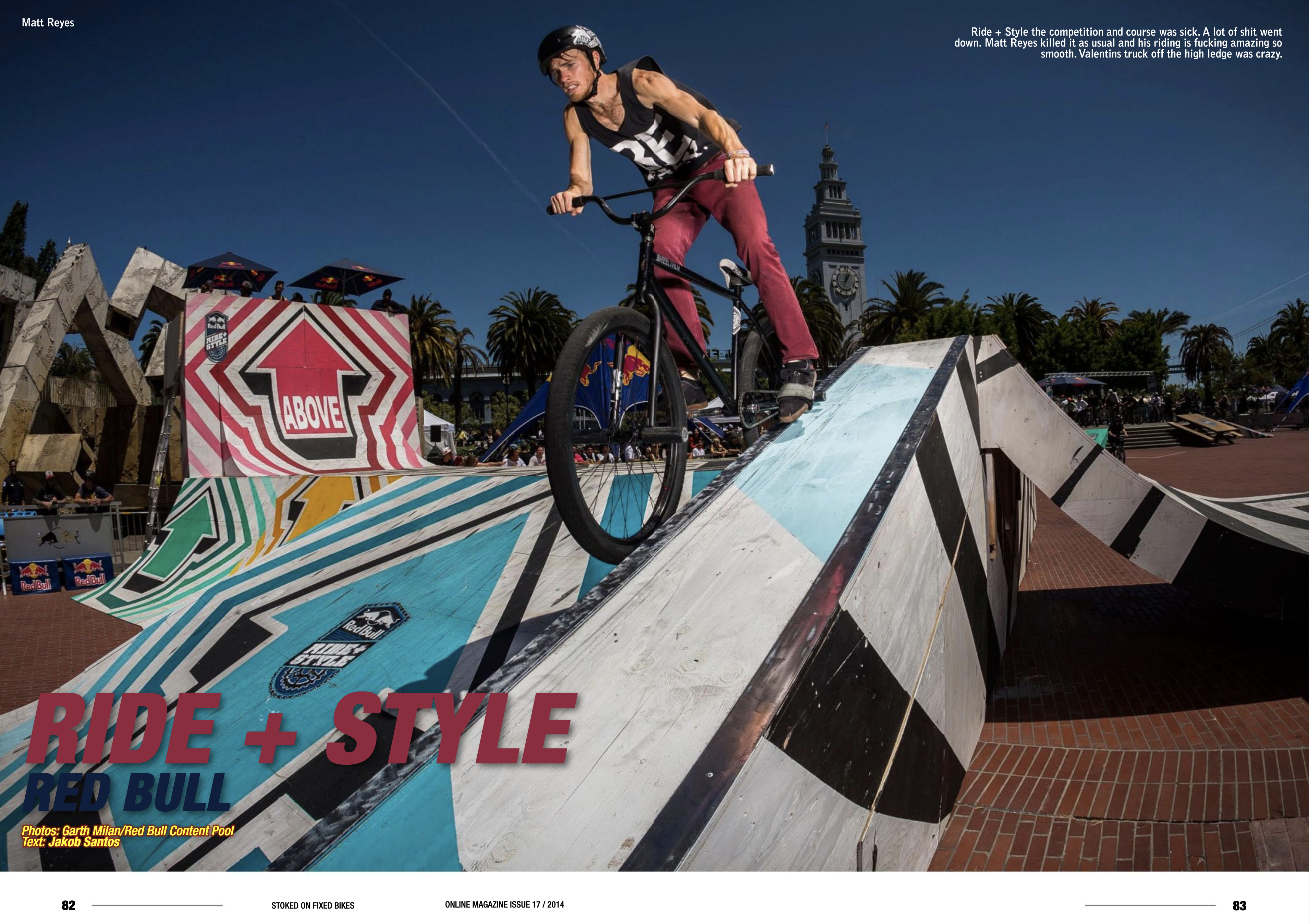 Red Bull Ride + Style 2014 was the 4th and final fixed gear freestyle and track racing event hosted by Red Bull at Justin Herman Plaza in San Francisco. The trick portion of the event was invite only to compete.