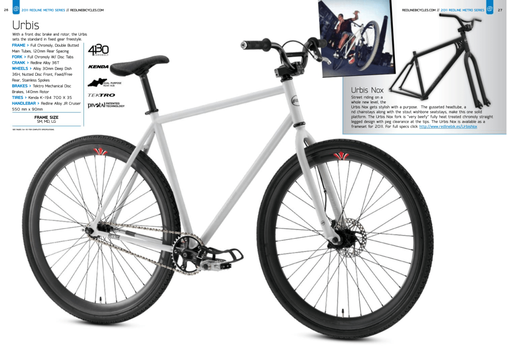 Hop on Redland’s Urbis, an urban-bred trick machine, and make the city your playground. Its chromoly frame has freestyle-specific geometry for smooth tricks and fluid riding down every avenue. You wanna do barspins? No problem – Redline routes the front disc brake cable through the headtube so you can sit back and spin to your heart’s content. And, components like burly deep-V wheels with Kenda tires, mini riser bars and a Tektro front disc brake let you rule the world of fixed-gear freestyle. No matter where you go, the Urbis will get you there in simple fixed-gear style.