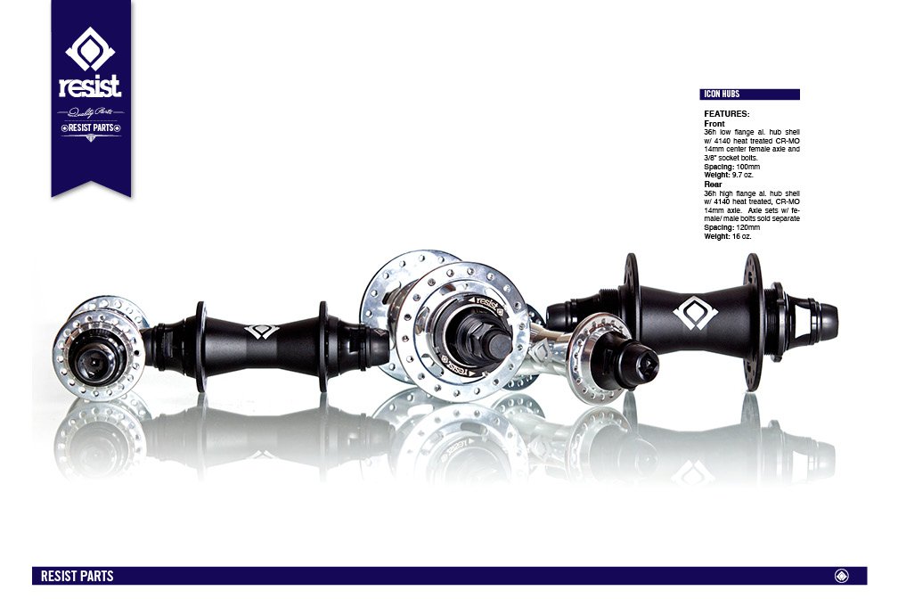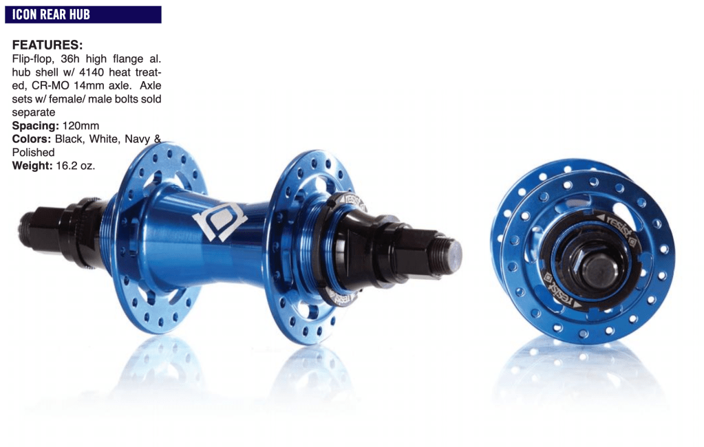 - 36h low flange al. hub shell w/ 4140 heat treated CR-MO 14mm center female axle and 3/8” socket bolts.