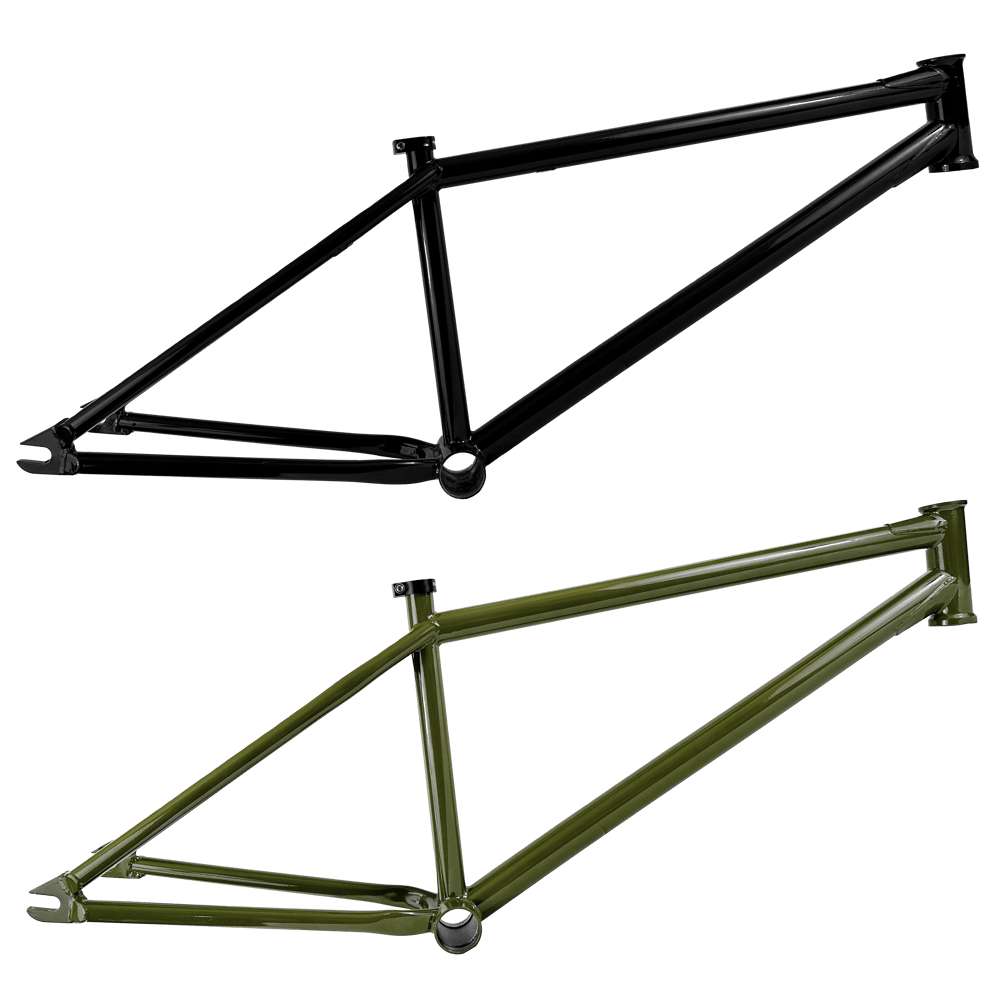 - Black frames have a 120mm tall head tube and clearance for 26″ x 2.3″ tires slammed