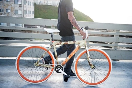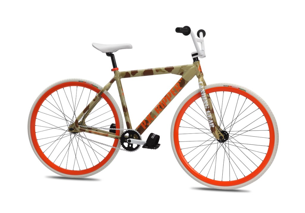 Los Angeles based clothing label Crooks & Castles has teamed up with SE Bikes to create a limited edition version of the PK Ripper Fixed Gear. Taking the aesthetics of the classic PK with floval tubing, wish bone chain stays and Landing Gear forks, Crooks & Castles has spiced up the bike under a Hunting Club motif with a Desert Camo frame and Safety Orange accents offset by a white bars, tires, and Crooks “Elite Medusa” embossed seat.