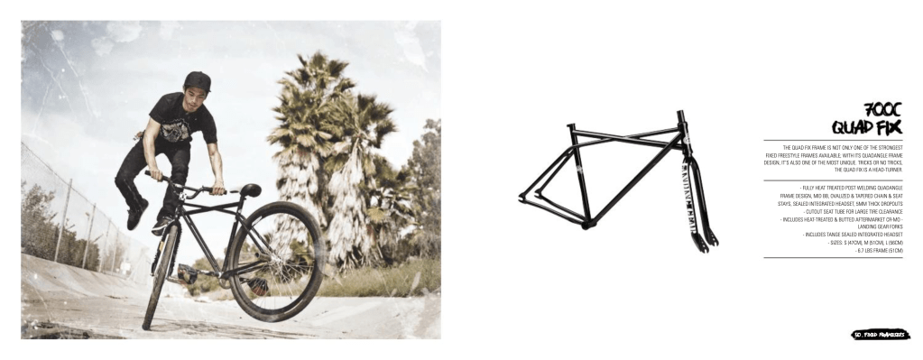 The Quad Fix frameset offers the same quality and high-end engineering as the Us Versus Them frameset: fully heat-treated frame & fork, sealed integrated headset, cut-out seat tube for large tire clearance, mid-BB, and 14mm rear axle slots. It also comes equipped with adapters for 3/8″ axles. The Quadangle frame design is not only the most unique looking frame on the market, but it also allows for an extremely low stand-over. The forks accept pegs. Available in 3 sizes: S (47cm), M (51cm), L (56cm).