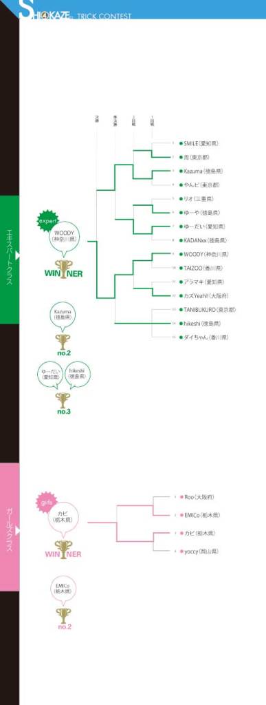 hikeshi (Tokushima Prefecture), Rio (Mie Prefecture), TAIZOO (Kagawa Prefecture), Shu (Tokyo), Kazuma (Tokushima Prefecture), TANIBUKURO (Tokyo), Aramaki (Aichi Prefecture), WOODY (Kanagawa Prefecture), Yanpi (Tokyo), KazuYeah!! (Osaka Prefecture), Yuya (Tokushima Prefecture), KADANxx (Tokushima Prefecture), SMILE (Aichi Prefecture), Yudai (Aichi Prefecture)