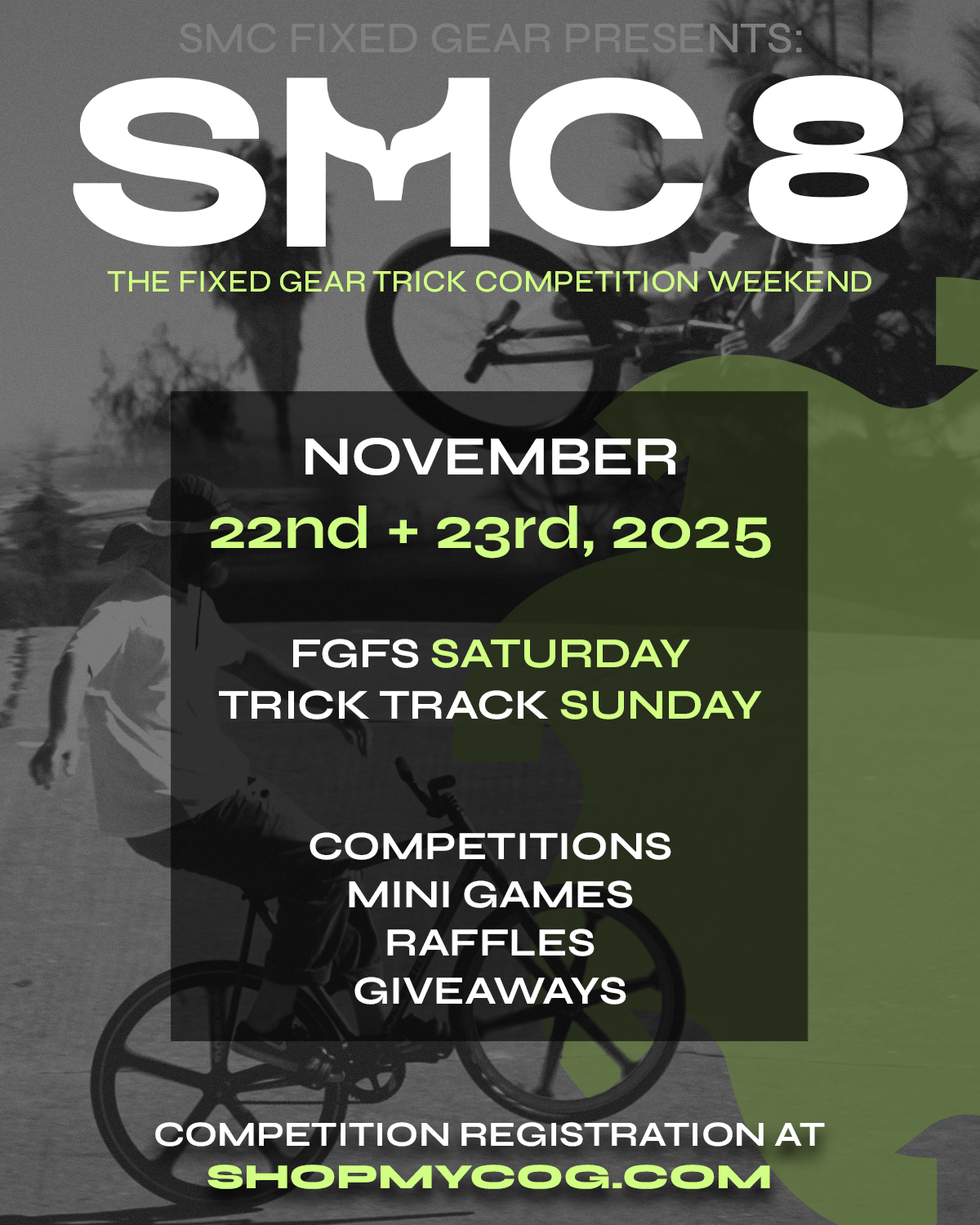 It’s official! We have sponsors and locations confirmed for the looming SMC 8 Fixed Gear trick weekend! Sat + Sunday November 22nd + 23rd the SMC competition series is back to bring you the best Fixed Gear riding from around the world straight to your eyes.