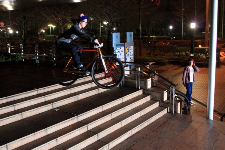 Teppei, better known as Nasty, is one of the longest standing professional FGFS riders to date. From 2009 to present day, Teppei has been tearing the scene up with his instantly recognizable style. Identifiable by his fast skid variations, long fakie sliders, and 700c pegless tricks, Nasty has been in the spotlight since the early days of FGFS for a reason.