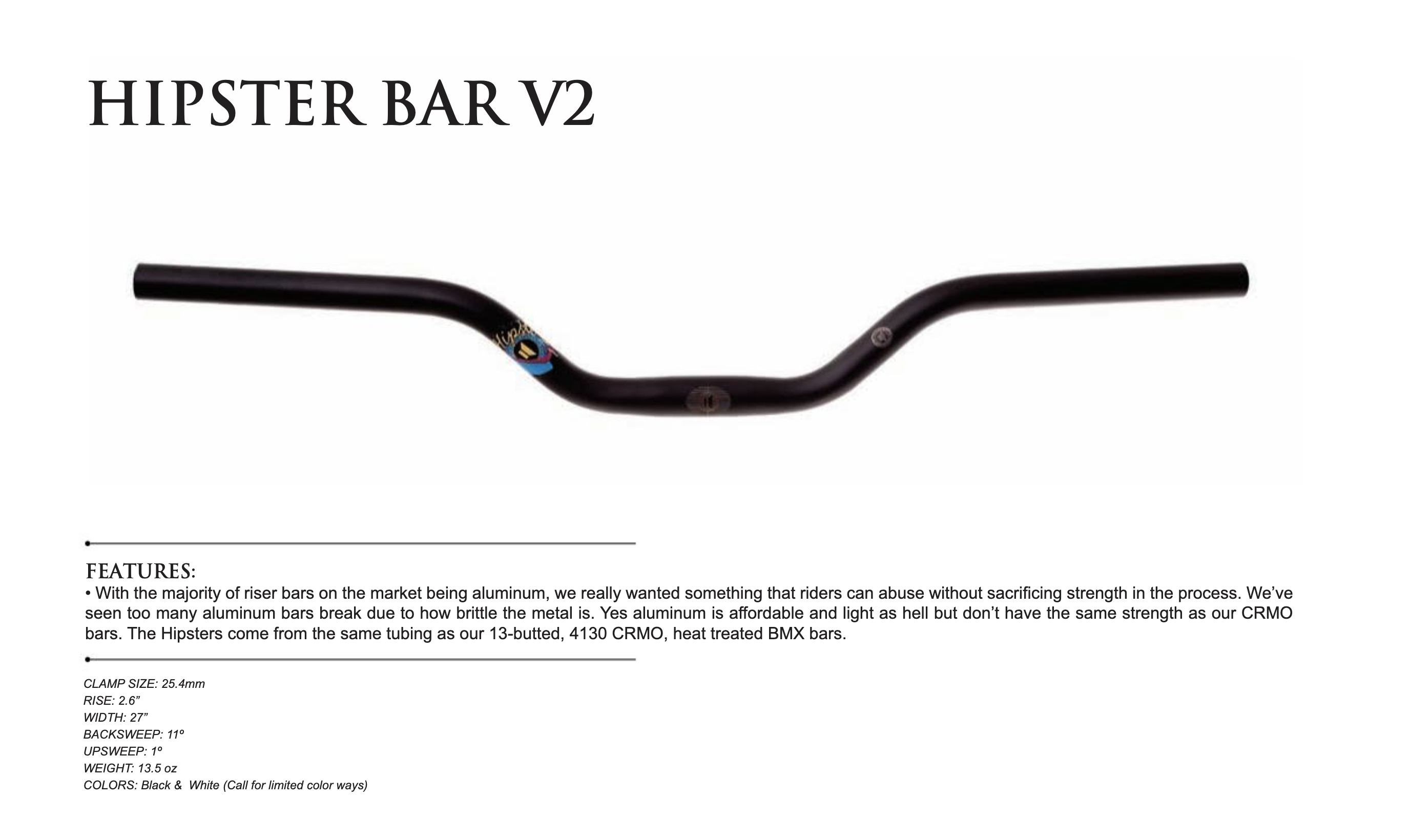 With the majority of riser bars on the market being aluminum, we really wanted something that riders can abuse without sacrificing strength in the process. We’ve seen too many aluminum bars break due to how brittle the metal is. Yes aluminum is cheap and light as hell but would you jump off a building with em’? The Hipsters come from the same tubing as our 13-butted, 4130 CRMO, heat treated BMX bars.