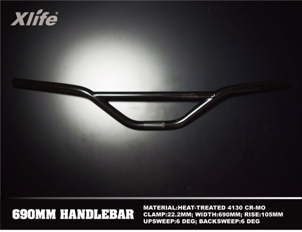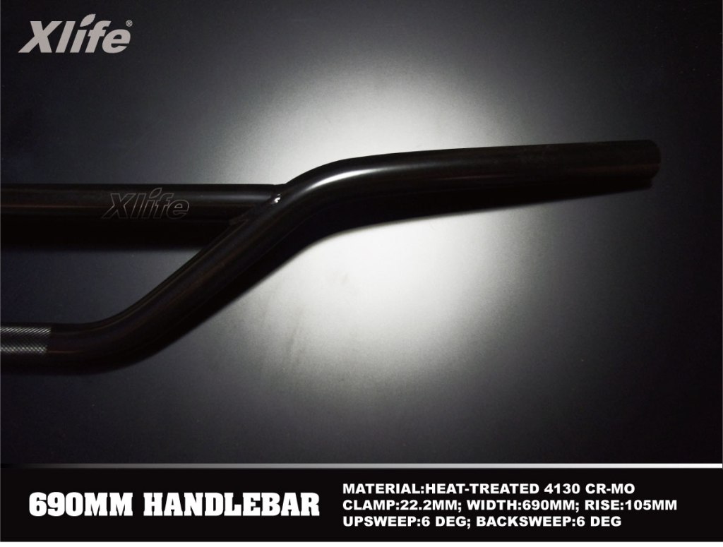 Xlife 690 V2 Handlebar Description: The new 690mm handlebar are designed for negative bottom bracket frames. 4.1″ rise provides better clearance for riders to go big. Details: Release Date: June 2011 Manufacturer: Xlife MSRP: n/a Color(s): Black Size(s): 4.1″ Gallery: Specifications: Material: 4130 CR-MO heat-treated Clamp:22.2mm Width:690mm Rise:105mm Backsweep:6° Upsweep:6° See Also: Xlife 690 handlebar Xlife 615 handlebar Xlife