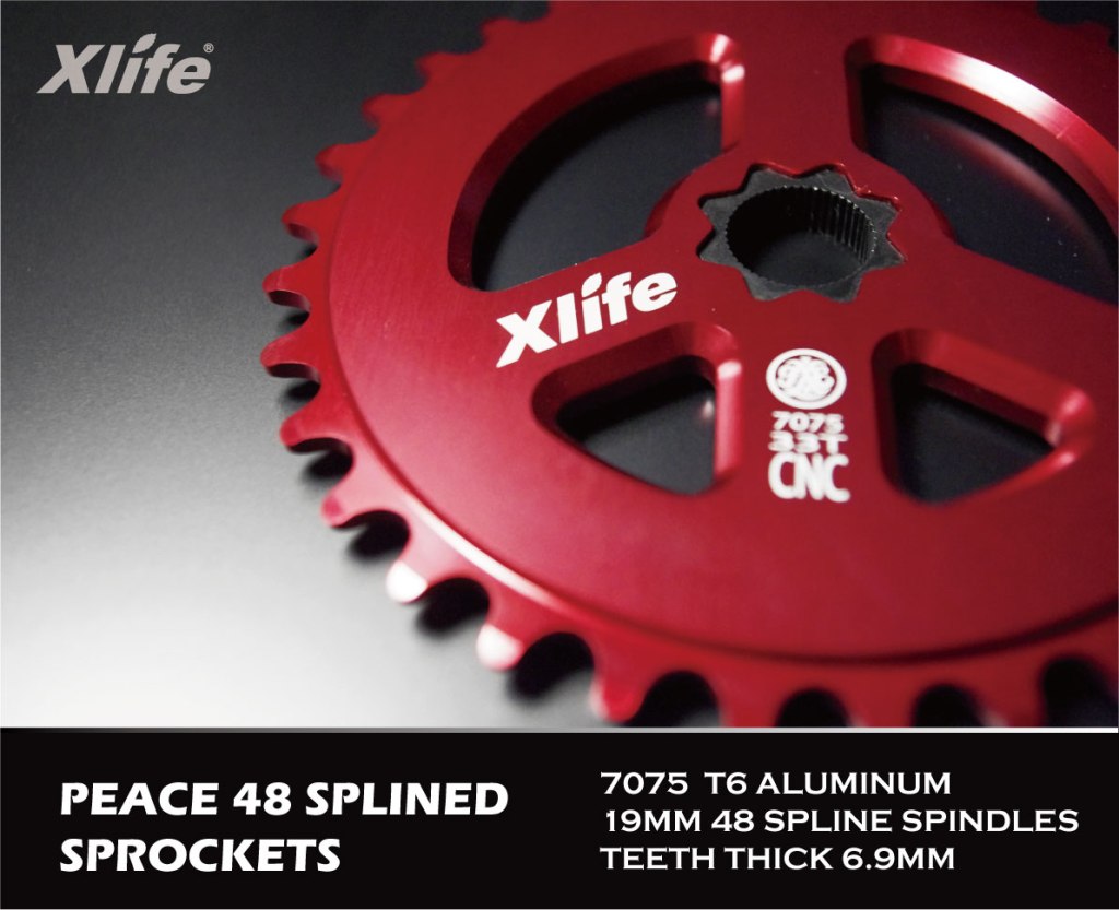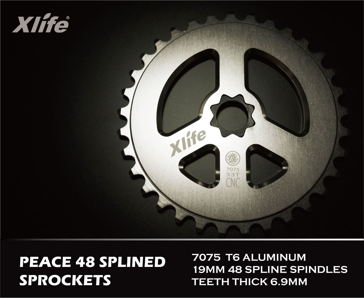 Xlife Peace Sprocket Description: n/a Details: Release Date: June 2011 Manufacturer: Xlife MSRP: n/a Color(s): Black Red Silver Spindle Size(s): 19mm Tooth Count(s): 33t 36t Gallery: Specifications: 7075 T6 aluminum 19mm 48 spline spindles Teeth thick 6.9mm Weight: 36t (197g), 33t (180g) See Also: Xlife Peace Cr-Mo sprocket Xlife