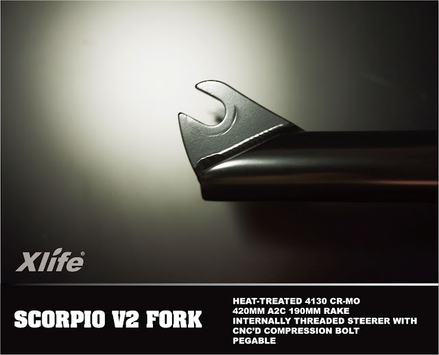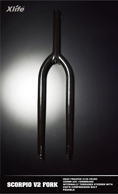 Xlife Scorpio V2 Fork Description: The V2 fork has a larger back sweep than the previous V1 fork. Details: Release Date: June 2011 Manufacturer: Xlife MSRP: n/a Color(s): Black Wheel Size: 700c / 26″ Gallery: Specifications: Heat-Treated 4130 Cr-Mo 420 A2C 190mm Rake Internally threaded steerer with CNC’d compression bolt Pegable See Also: Xlife Scorpio V2 frame Xlife