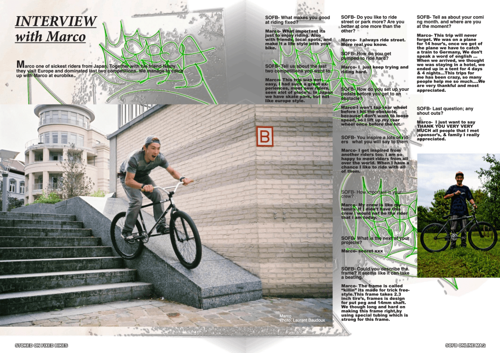 Yuhei “Marco” Hirose is a pro Japanese rider who made his debut in 2010 with a Bootleg Sessions 4 DVD solo section. His stardom surpassed Fixed Gear culture as he became a notable figure within the fashion, modelling, and overarching bicycle communities.